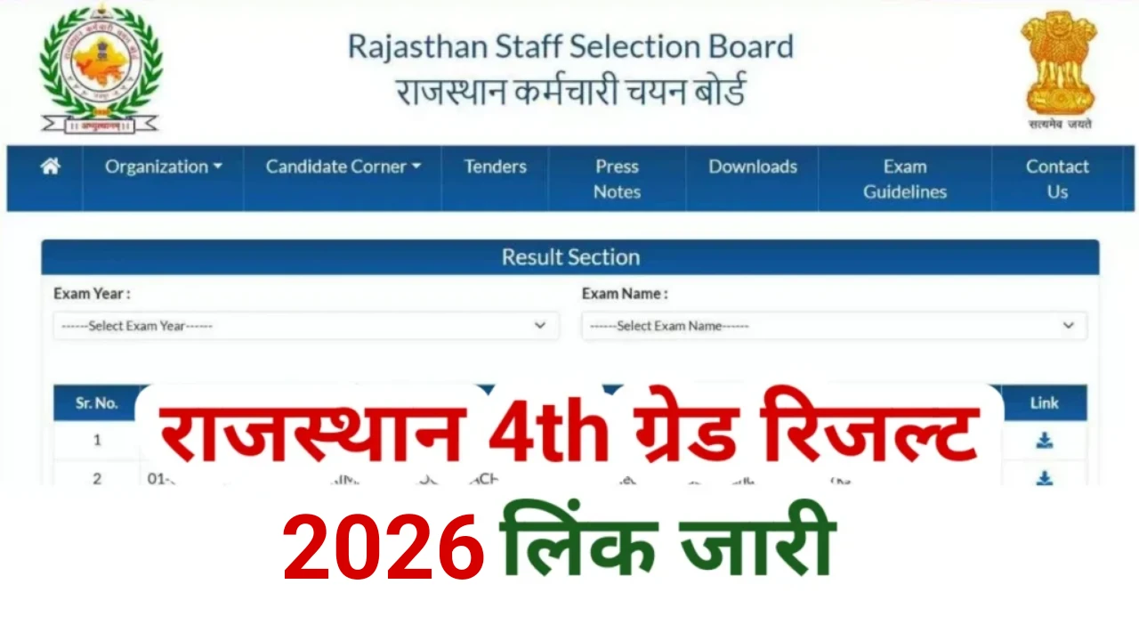 Rajasthan 4th Grade Result 2025: राजस्थान के लाखों उम्मीदवारों के लिए बड़ी खबर सामने आ रही है। Rajasthan Staff Selection Board (RSMSSB) द्वारा आयोजित 4th Grade Recruitment Exam 2025 का रिजल्ट जारी कर दिया है। परीक्षा में शामिल अभ्यर्थी बेसब्री से Rajasthan 4th Grade Result 2026 का इंतजार कर रहे हैं। उन सभी का रिजल्ट को लेकर इंतजार खत्म हो गया है। आज rssb 4 grade result 2026 rajasthan जारी कर दिया है। अभ्यर्थी ऑफिशल वेबसाइट से रिजल्ट चेक कर सकते है।
